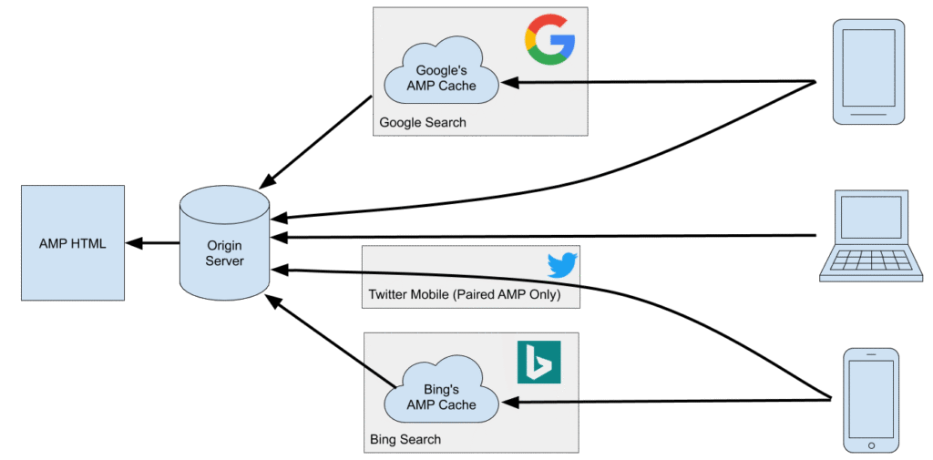 Lưu trữ bản sao trang AMP: Khi bạn xuất bản một trang AMP hợp lệ, các con bọ của Google sẽ quét qua, xác thực và tạo một bản sao của trang đó. Bản sao này sau đó được lưu trữ trên các máy chủ của AMP Cache trên khắp thế giới. Quá trình này hoàn toàn tự động.